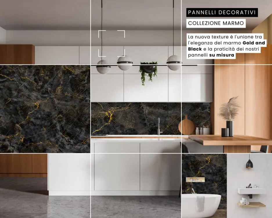 Oltre al marmo naturale, puoi optare per l'utilizzo di pannelli con stampa effetto marmo in alta definizione. Questi pannelli, realizzati in alluminio composito dello spessore di soli 3 mm, offrono un aspetto naturale con un'alta precisione di dettagli e venature. La tecnologia di stampa avanzata consente di riprodurre fedelmente le caratteristiche del marmo con le sue venature dorate, creando un effetto visivo molto simile al materiale originale.
