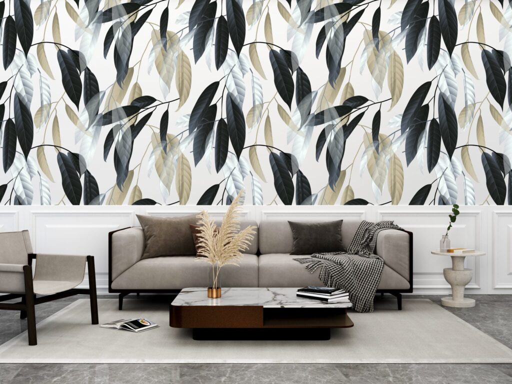 Elegante e contemporanea, questa carta da parati a motivo botanico interpreta il tema delle foglie in chiave sofisticata e moderna. Le fronde stilizzate, declinate in tonalità nere, avorio e oro caldo, si sovrappongono con leggerezza creando un raffinato gioco di trasparenze e profondità visiva. Il disegno ripetuto dona ritmo alla parete senza appesantire lo spazio, rendendo questa grafica ideale per ambienti living, camere da letto, zone lounge e progetti contract come hotel e boutique. La palette neutra e ricercata si abbina perfettamente a interni contemporanei, minimal ed eleganti, valorizzando arredi e materiali con discrezione.