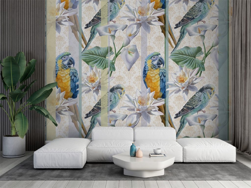 Porta nella tua casa un’esplosione di vitalità e raffinatezza con la carta da parati Ornamental Parrot. Ispirata all’eleganza tropicale, questa creazione fonde pappagalli variopinti, fiori esotici e foglie lussureggianti su uno sfondo avorio impreziosito da un delicato motivo ornamentale. Le bande verticali trasparenti, nei toni del verde acqua e dell’oro tenue, aggiungono ritmo e leggerezza al design, creando un effetto visivo dinamico ma armonioso. "Ornamental Parrot" è perfetta per dare un tocco audace e sofisticato a living, camere da letto o spazi creativi, trasformando le pareti in un vero capolavoro di natura e design.